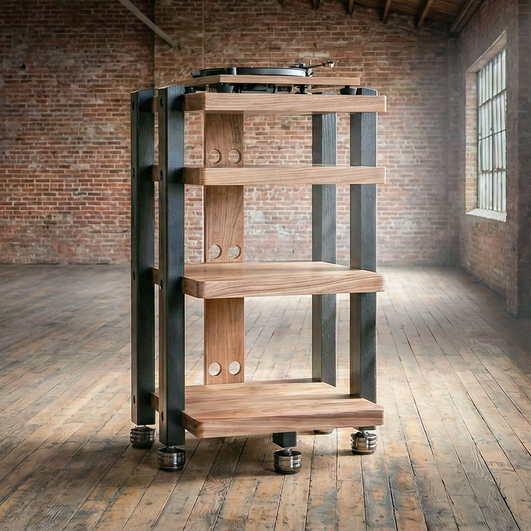 No cheap wood, veneer or flimsy construction here. Heavy hardwood, high-strength steel bolts, designed to last a lifetime and support the heaviest stereo components