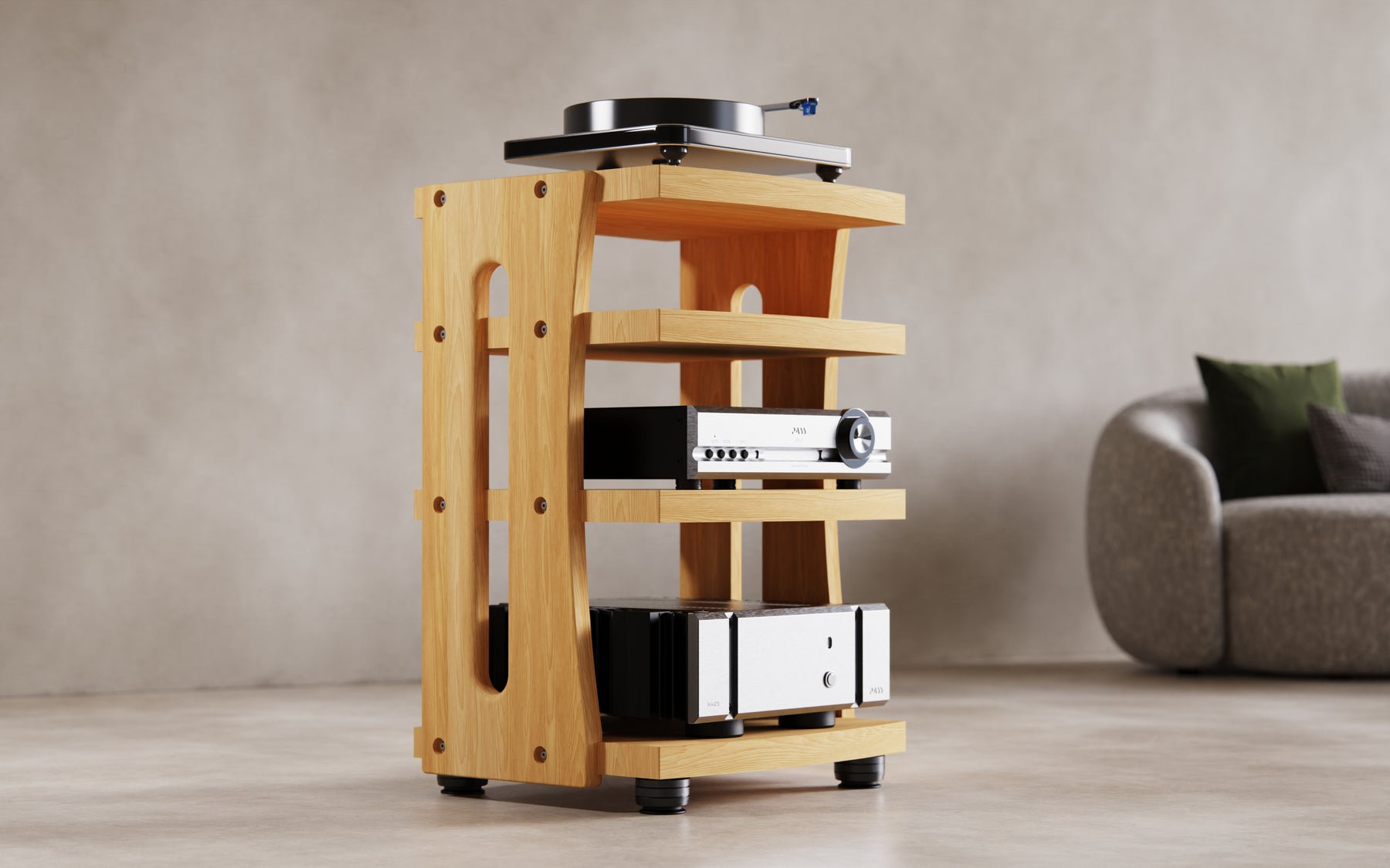Crafted from heavy, all‑hardwood construction and secured with high‑strength alloy steel hardware, the CONTOUR Audio Rack delivers rock‑solid stability. Precision‑cut dado joints lock every shelf into place for uncompromising rigidity. IsoAcoustics GAIA Neo feet complete the design to deliver un-paralleled vibration isolation.