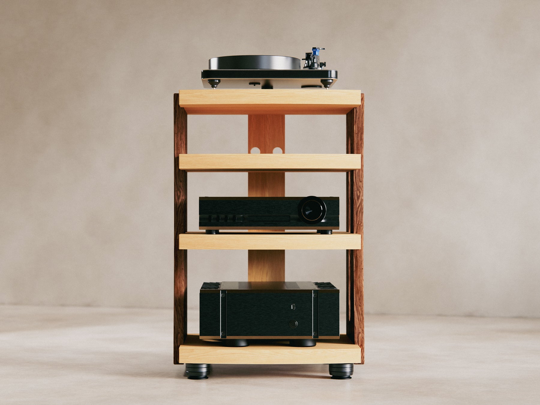 Crafted from heavy, all‑hardwood construction and secured with high‑strength alloy steel hardware, the CONTOUR Audio Rack delivers rock‑solid stability. Precision‑cut dado joints lock every shelf into place for uncompromising rigidity. IsoAcoustics GAIA Neo feet complete the design to deliver un-paralleled vibration isolation.