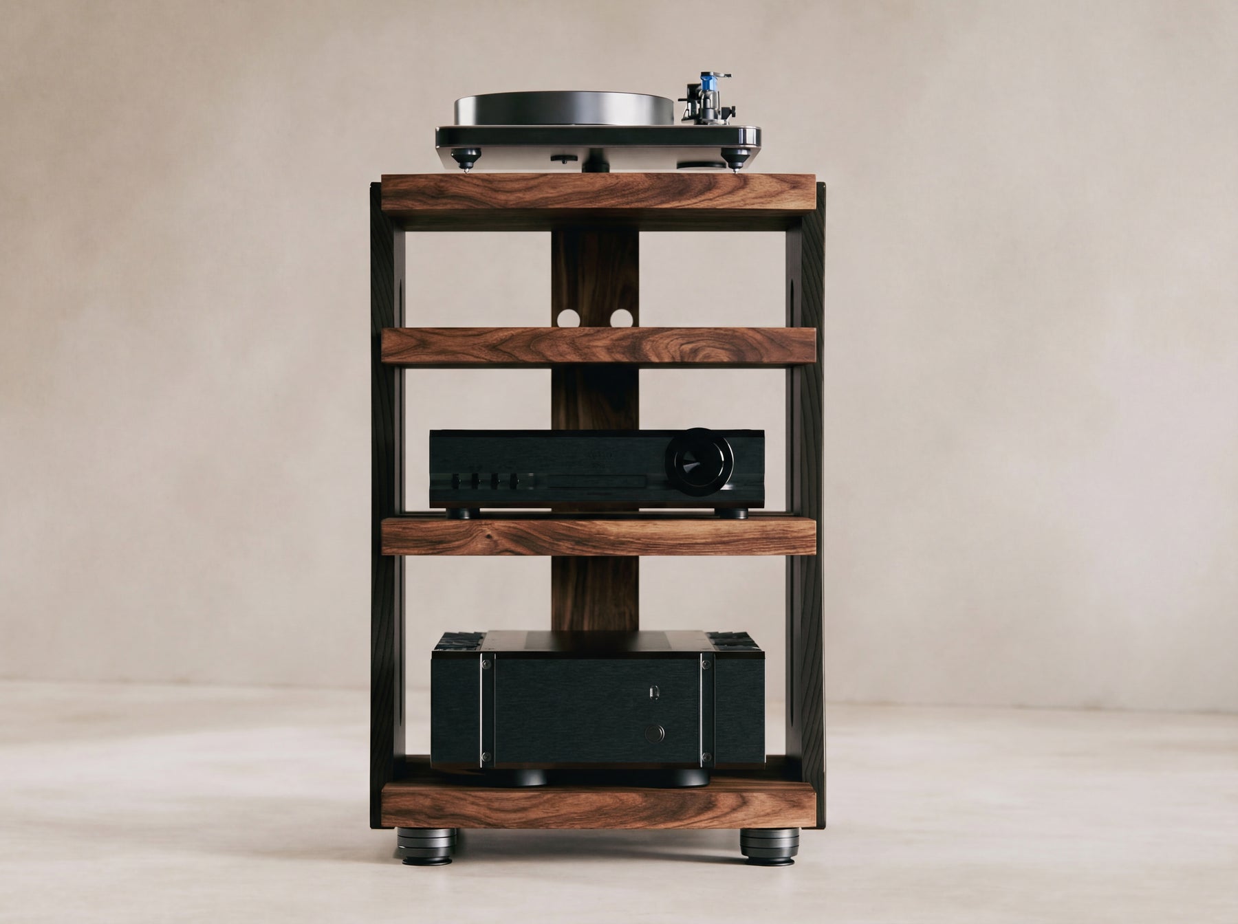 Crafted from heavy, all‑hardwood construction and secured with high‑strength alloy steel hardware, the CONTOUR Audio Rack delivers rock‑solid stability. Precision‑cut dado joints lock every shelf into place for uncompromising rigidity. IsoAcoustics GAIA Neo feet complete the design to deliver un-paralleled vibration isolation.